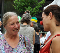 Wir machten Aktionen auf der Straße (z.B. Waren wir bei einer Demo-Veranstaltung) oder bespielten Orte, die für Clowns nicht üblich sind (z.B. in der Aufbahrungshalle beim Tag des Friedhofs). Dadurch haben wir auch ein Gespür bekommen, welche Spielweise von Nöten ist an Orten der Fürsorge und Heilung.